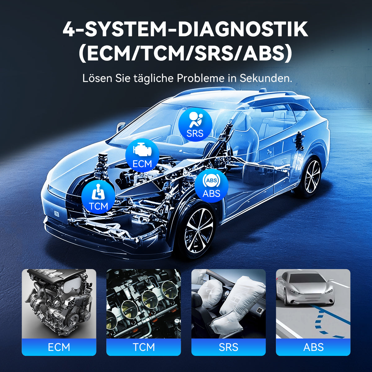 • Vier-System-Diagnose(ECM,TCM,ABS,SRS) & Vollständige OBDⅡ-Funktionen.