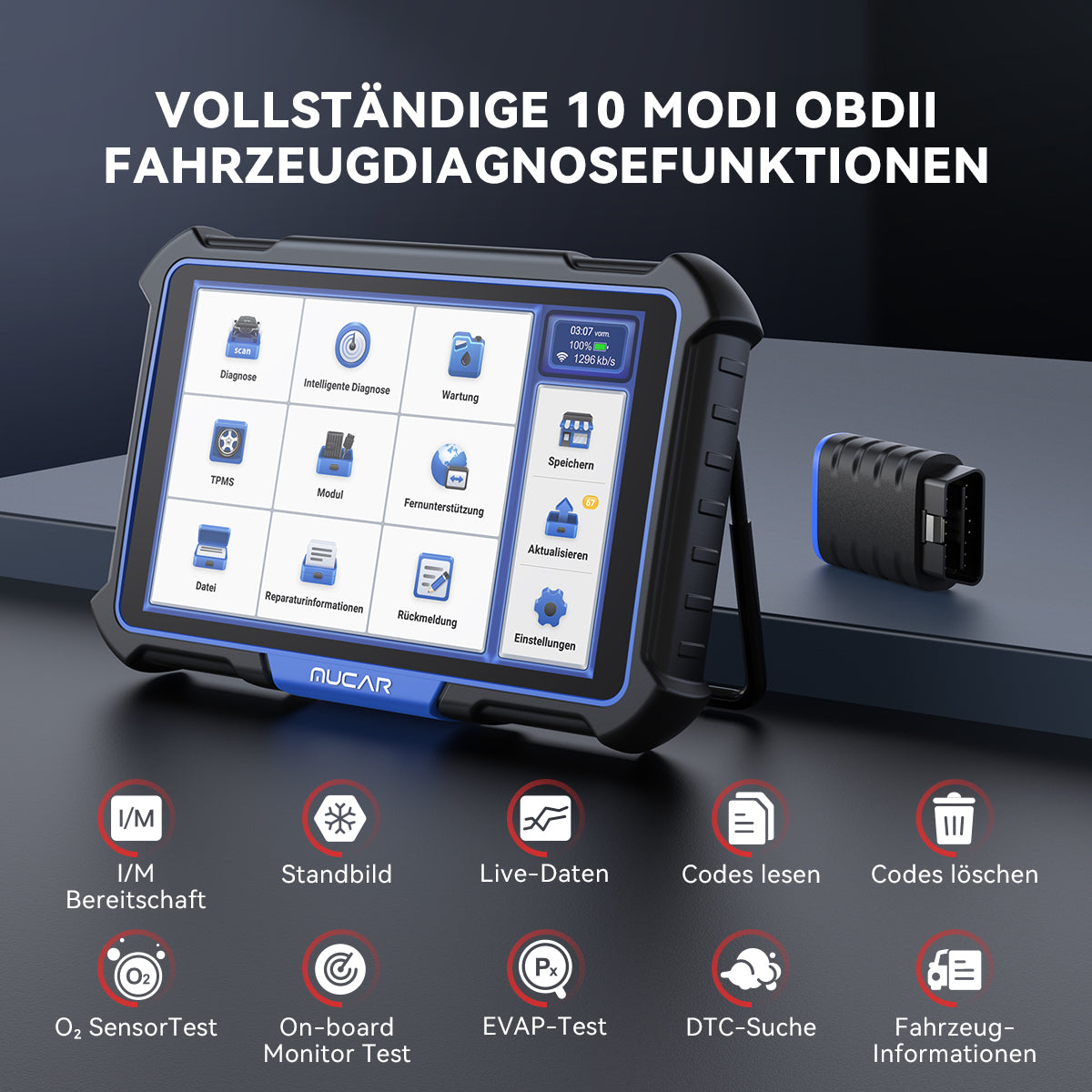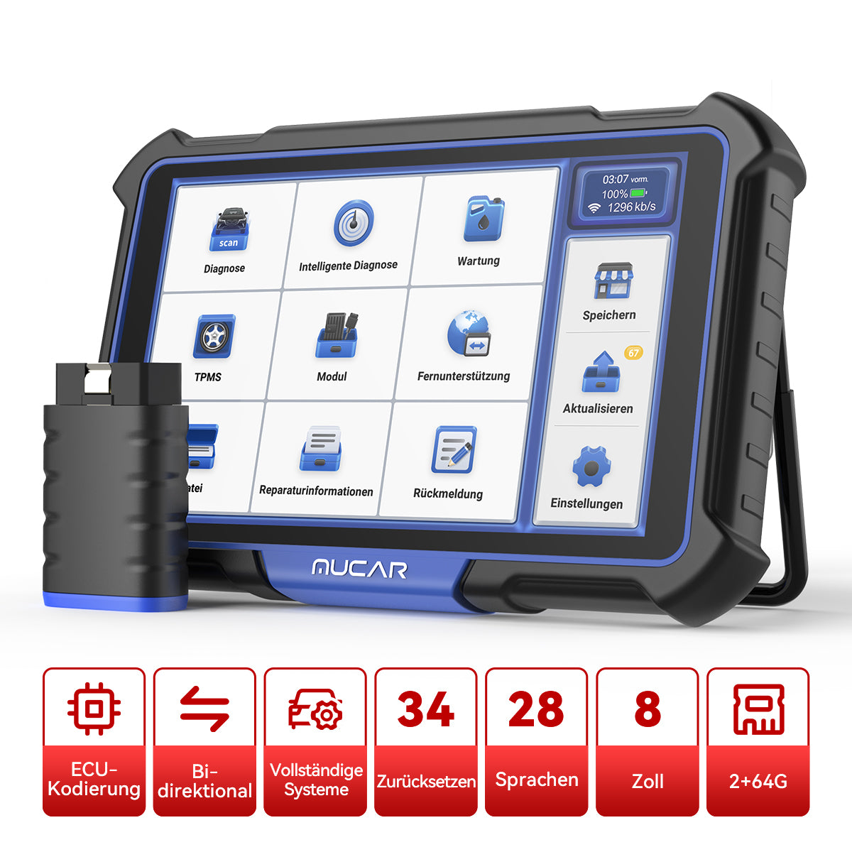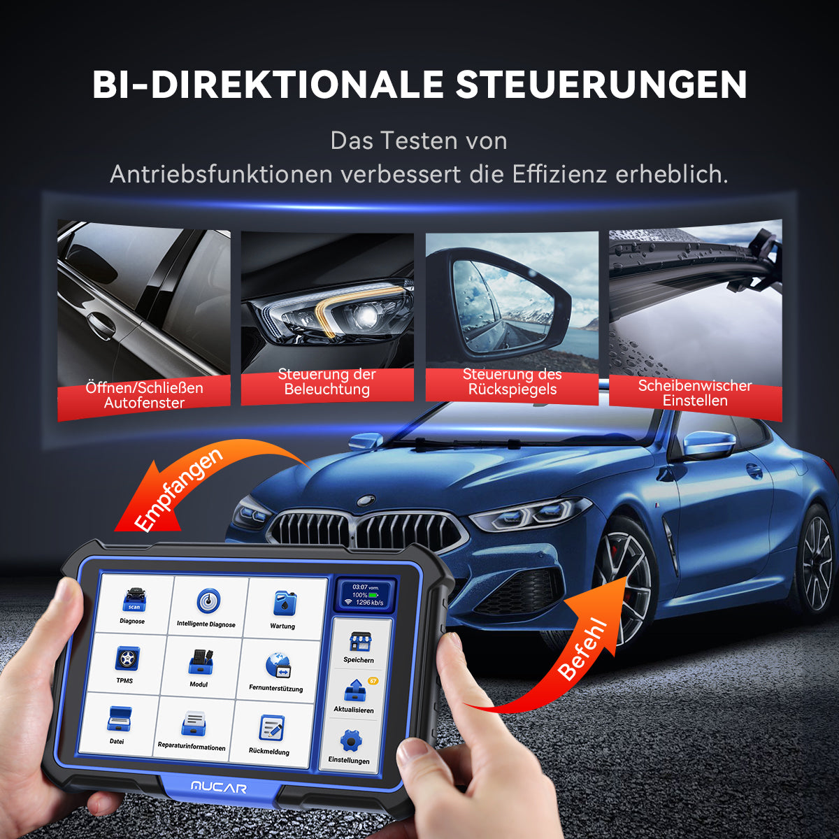 MUCAR VO8 unterstützt verschiedene erweiterte Kfz-Diagnosefunktionen (ohne Programmierfunktion). Bidirektionales Scan-Tool kann Informationen anfordern oder ein Modul befehlen, bestimmte Tests und Funktionen durchzuführen, während die resultierenden Daten gleichzeitig beobachtet werden, um Ihnen eine Menge Zeit zu sparen.