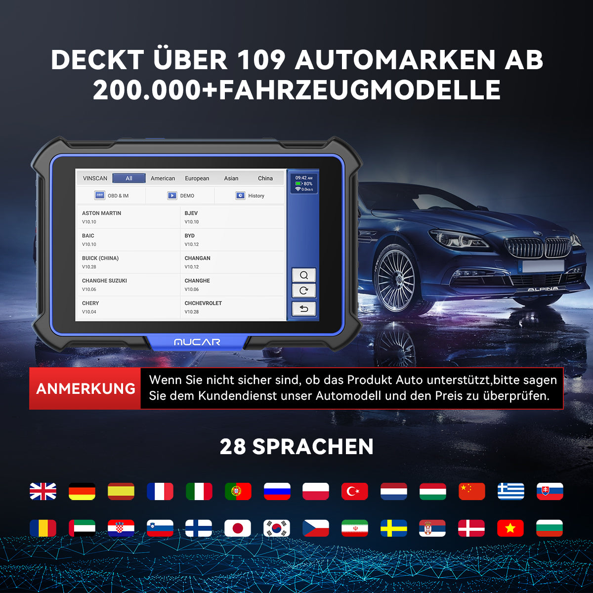 MUCAR VO8 OBD2-Scanner-Diagnose-Tool kann OE-Level-Diagnose und Analyse auf alle verfügbaren Systeme durchführen: ECM, TCM, ABS, SRS, BCM, BMS, TPMS und Klimaanlagen, etc. Durch das Lesen/Löschen von Codes, das Anzeigen von Live-Daten, das Abrufen von ECU-Informationen und das Ausführen aktiver Tests und Servicefunktionen können Fehler genau lokalisiert werden. Mit nur einem einfachen Klick erhalten Sie eine genaue und detaillierte Diagnose.